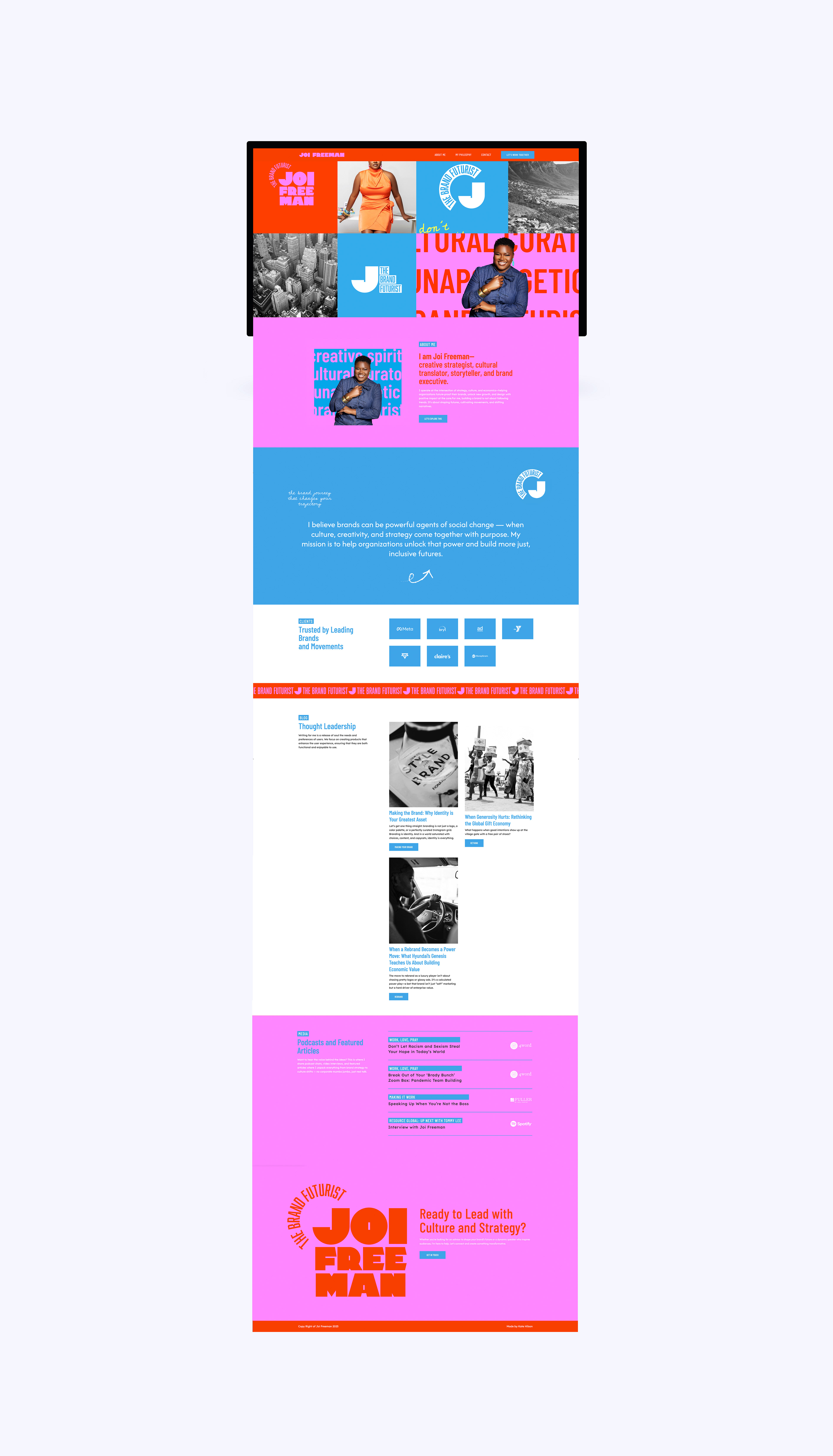 Designing and developing a website for Joi Freeman would focus on creating an engaging and modern digital presence. The core design philosophy would leverage parallax scrolling, providing a dynamic, multi-layered visual experience as visitors scroll down the page, adding depth and narrative flow. The overall development prioritises a clean, responsive layout to ensure the parallax and animations perform smoothly across all devices, ultimately reflecting a professional yet down-to-earth aesthetic that aligns with a professional-but-down-to-earth tone.